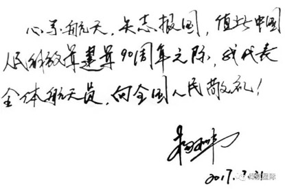 “要胸怀航天强国梦想,强化使命担当,加强技术创新和实践创造,不断刷新进军太空的中国高度。”2017年6月22日,习近平主席在视察驻晋部队某基地时的重要讲话,再次点燃航天人新的梦想。广大航天员表示:“我们一定要牢记习主席的嘱托,在建设航天强国的道路上,不忘初心,砥砺奋进,以共产党员永远冲锋的昂扬斗志,继续奔向太空更深处!”