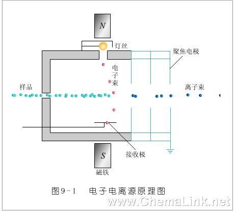 电子轰击离子化(electron impact ionization,EI)EI是最常用的一种离子源,有机分子被一束电子流(能量一般为70eV)轰击,失去一个外层电子,形成带正电荷的分子离子(M+),M+进一步碎裂成各种碎片离子、中性离子或游离基,在电场作用下,正离子被加速、聚焦、进入质量分析器分析