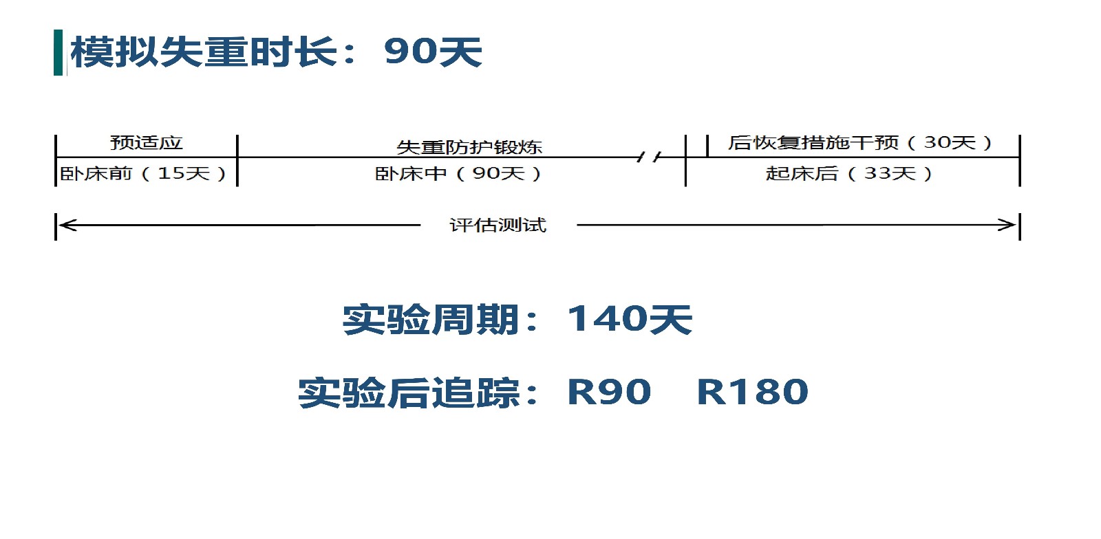 “地星二号”实验的实施主要分为三个阶段:卧床前适应测试期15天、90天卧床期、起床后测试恢复期33天。所以,实验实际周期跨度达到140余天。